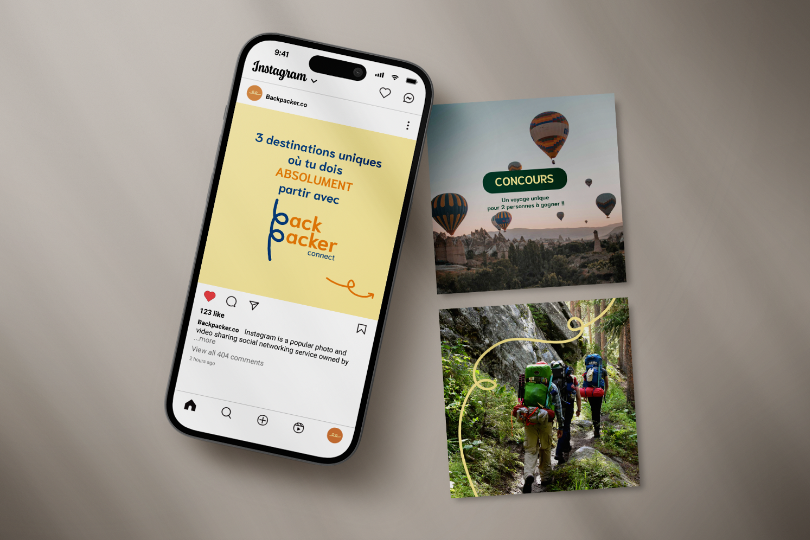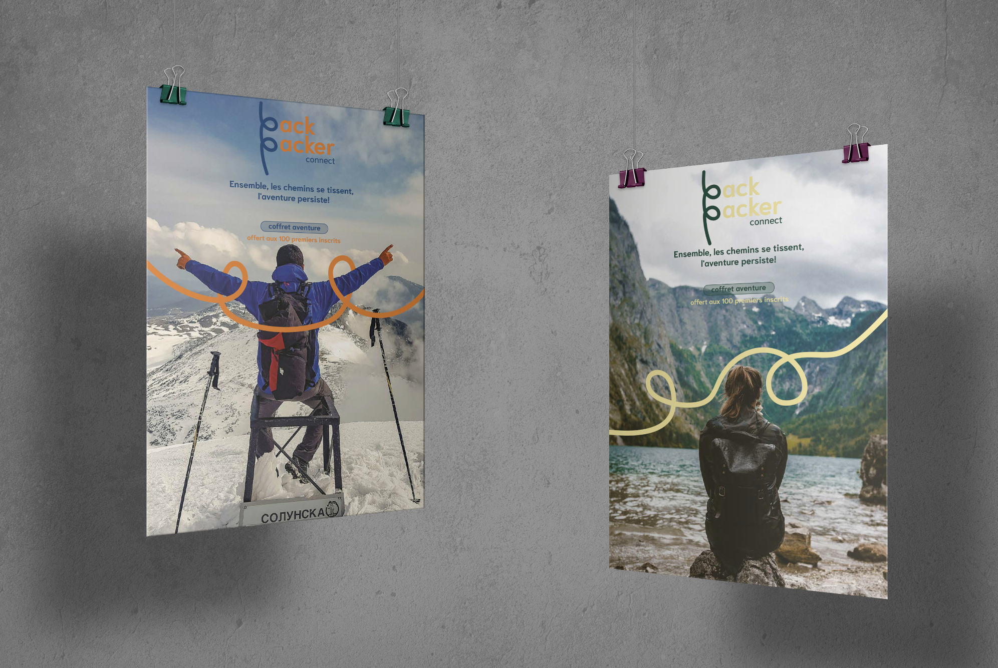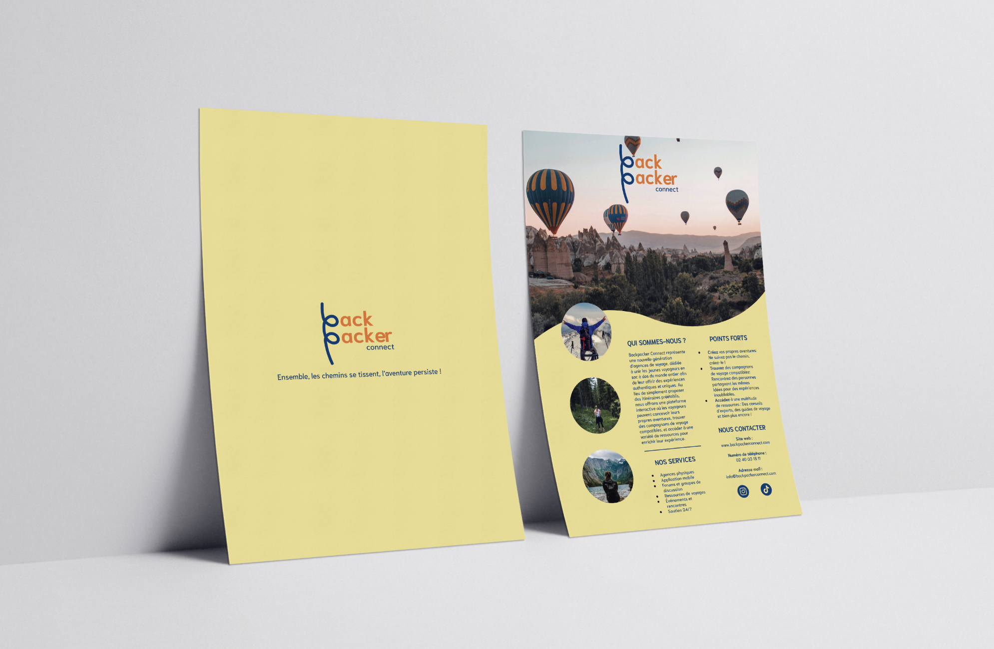 Création de l’identité visuelle et les supports de communication de « backpacker connect », une agence de voyage pour jeunes voyageurs en sac à dos, en reflétant leurs valeurs et services.